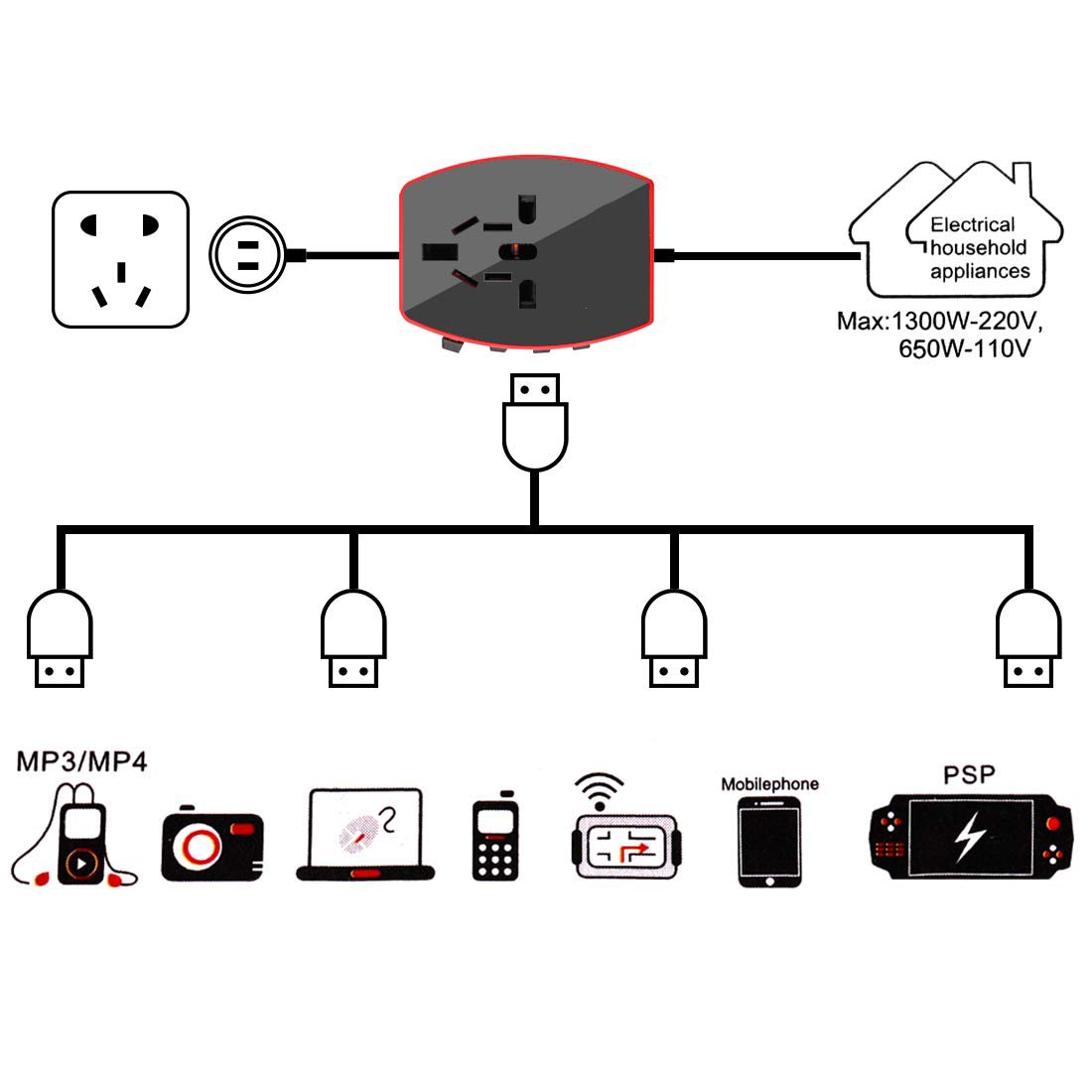 - 5 in 1 International Power Adapter: The european adapter provides 1 universal AC outlet and 4 USB charging ports, max capacity up to 2400 watt (max 240 Volt, 10 A), can charger up to 5 devices Simultaneously; This adapters for europe is suitable for hotel, bedroom, and college dorm room.