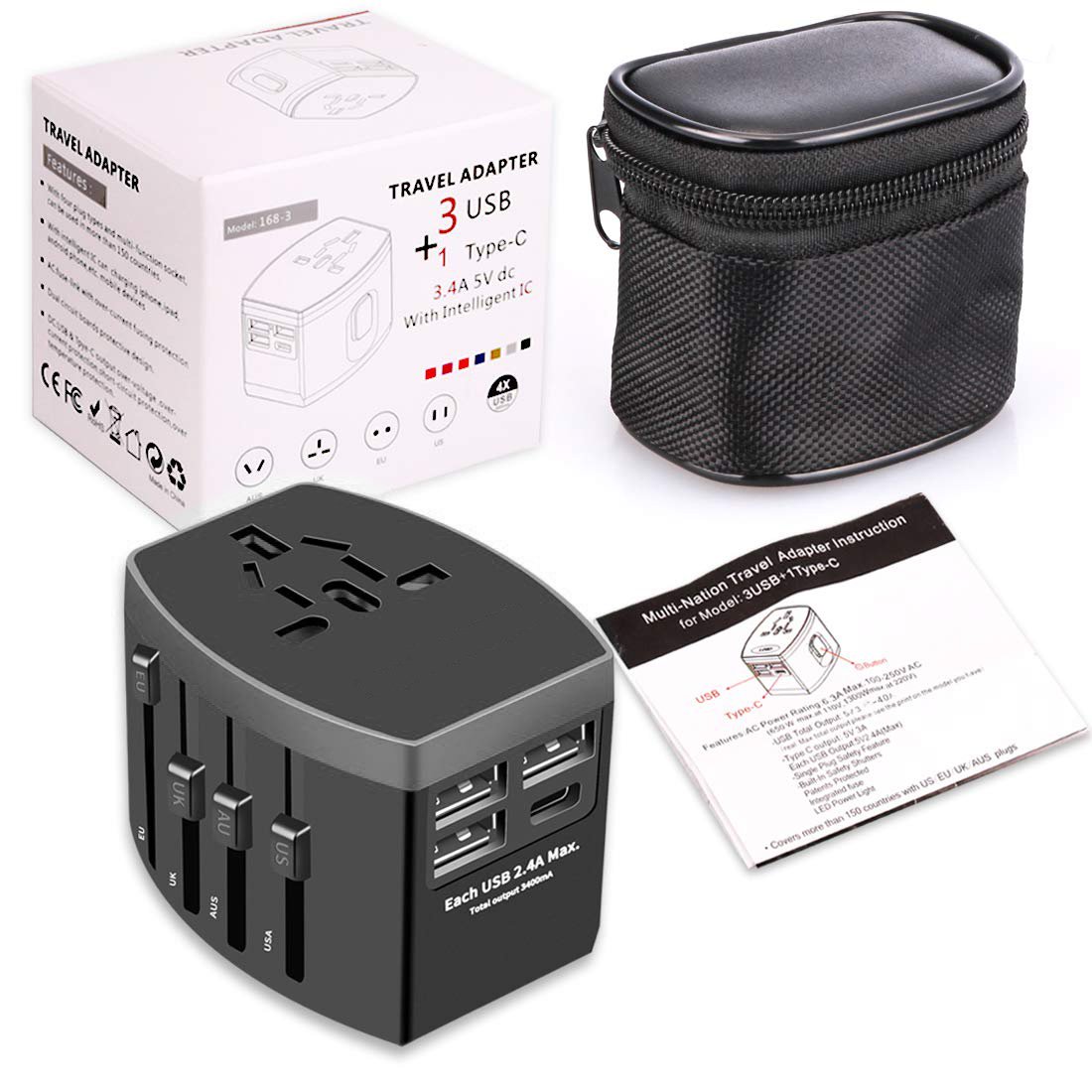 - 4 USB Charging Ports Universal Plug Adapter: The 2 USB A ports can charge up to 2.4 A, and the 2 USB C ports can charge up to 3A, ideal for cell phone, camera, ect. All the USB ports output: 5V/3.4A,15W max.