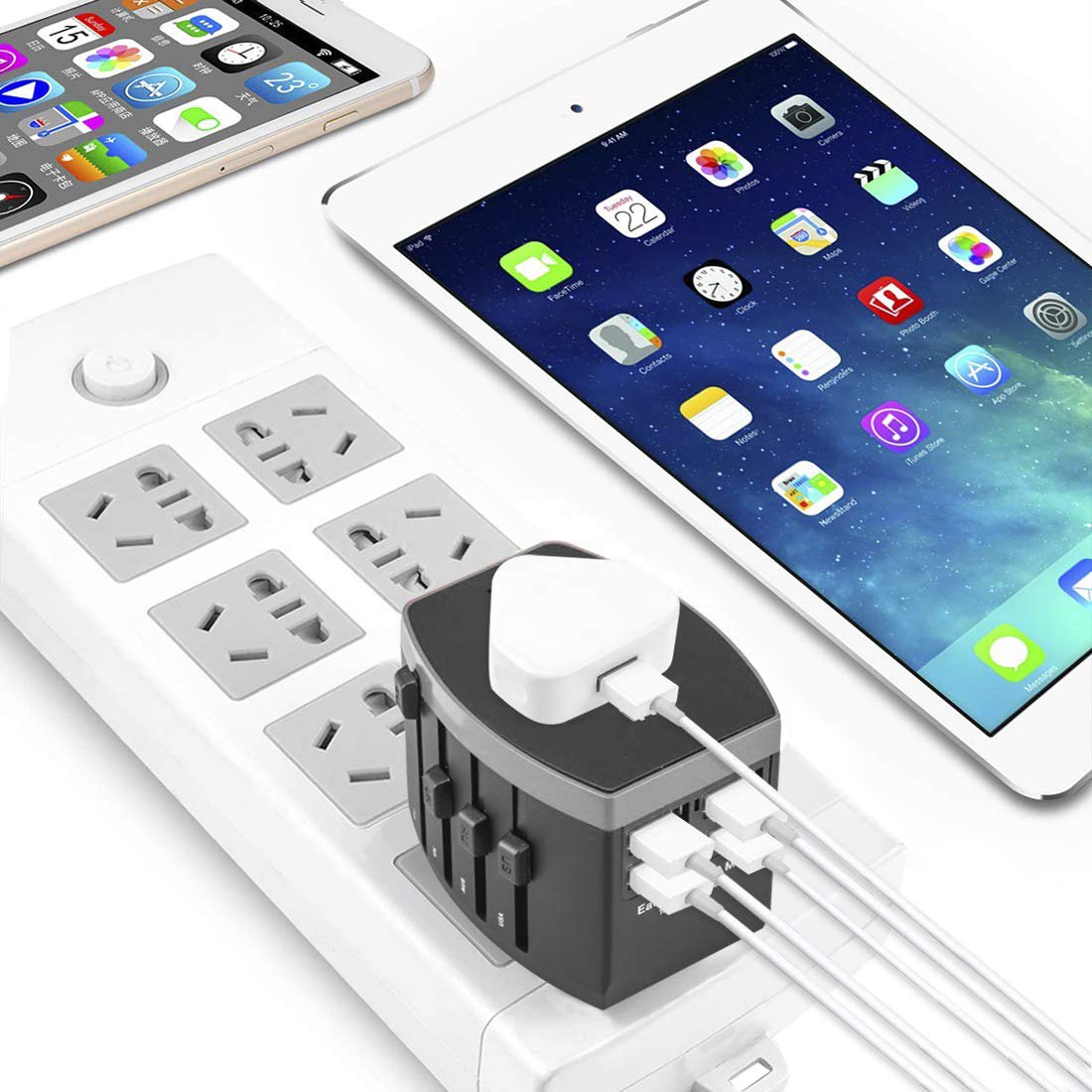 - 5 in 1 International Power Adapter: The european adapter provides 1 universal AC outlet and 4 USB charging ports, max capacity up to 2400 watt (max 240 Volt, 10 A), can charger up to 5 devices Simultaneously; This adapters for europe is suitable for hotel, bedroom, and college dorm room.